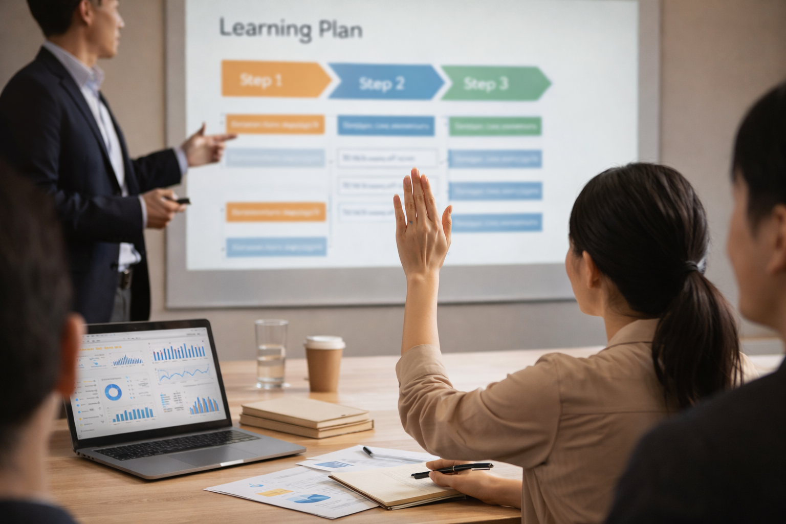 研修の設計から実施、進行、振り返りまでを一体で支援するプランです。学習成果を確認しながら、現場で活用しやすい形で研修を実施します。